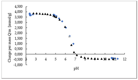 A Mettler Toledo DL 53 titrator with a 10-mL burette was used for evaluation of the chitosan desorption. Firstly, 50 µL of the polyelectrolyte titrant (polyethylene sulfonate sodium salt (PES-Na, c = 10 Mm) was added every 5–10 s. The analyte was composed of 30 mL of filtrated solution (desorbed chitosan), 9 mL of distilled water, and a few drops of indicator Toluidine blue O (Sigma-Aldrich). Before the titration, the pH was adjusted to 3.6 with HCl in order to establish full protonation of chitosan. The absorbance was measured as a potential change in mV with a Mettler-Toledo Phototrode DP660 at 660 nm. The concentration of NH3+ was determined from the equivalent volume (V) of the added polyethylene sulfonate sodium salt. Three replicates were performed for each sample.