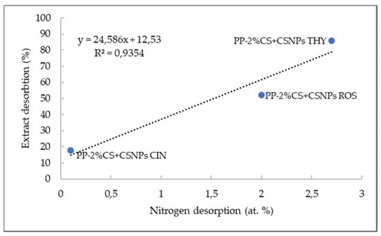 A very strong correlation between the extract release (in %) and nitrogen desorption (at.%) is seen from Figure 4. The correlation coefficient between both obtained values is 0.9354, which indicates that the amount of desorbed extract is directly proportional to the nitrogen desorption. This proves the fact that extracts are embedded into chitosan nanoparticles, and that the driving force for extract release is chitosan solubility. When chitosan is soluble, it may desorb from the foil surface, thus enabling extract release.