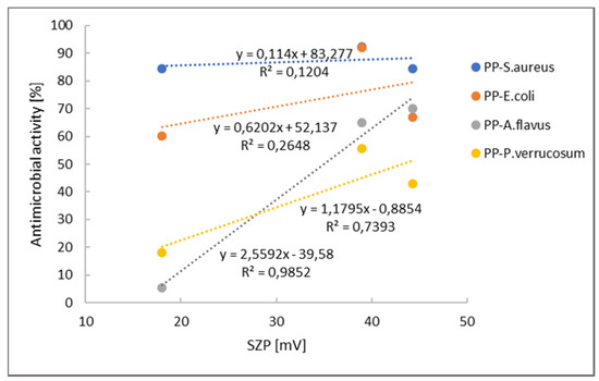 Figure 5 indicates that there is no correlation between the antimicrobial activity and positive ZP plateau level for bacteria. A coefficient lower than 0.4 is considered as weak or no correlation. In both cases, for S. aureus and E. coli, the coefficients are below 0.2 and 0.3, respectively. Oppositely, quite good correlation may be seen for fungi, A. flavus and P. verrucosum. It seems that for inhibition of fungi, the content of amino groups is important, whilst some other mechanisms are also involved for bacteria inhibition. The most accepted mechanism for microbial inhibition is the electrostatic interaction between positively charged chitosan molecules and negatively charged microorganism surfaces. Consistent with such a mechanism, antimicrobial activity will be greater if more cationic sites are available [37]. Additionally, another proposed mechanism is the binding of chitosan with microbial DNA, which leads to the inhibition of the messenger RNA (mRNA) and protein synthesis via the penetration of chitosan into the nuclei of the microorganisms. The third possible mechanism is the chelation of metals, suppression of spore elements, and binding to essential nutrients for microbial growth. It is well known that chitosan has excellent metal-binding capacities, where the amino groups in the chitosan molecules are responsible for the uptake of metal cations by chelation [38]. In general, such a mechanism is more efficient at high pH, where chitosan’s amino groups are unprotonated, and the electron pair on the nitrogen atom is available for donation to metal ions [37].