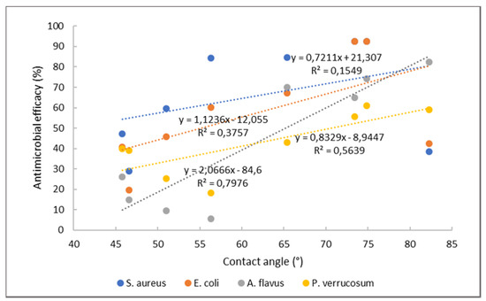 Correlation between contact angle and antimicrobial efficacy.
