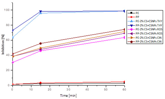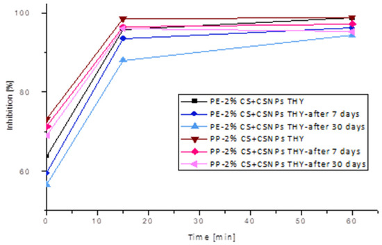 As can be seen, thyme extract has proven to be a very good antioxidant and the most promising coating embedded into chitosan nanoparticles. For this purpose, thyme extract was used for monitoring the antioxidant efficacy of functionalized foils one month after coating application. The results are presented in Figure 10, showing a very good stability of the CSNPs THY layer on polyethylene and polypropylene surfaces. After seven days, a 5% reduction of antioxidative activity for PE and a 3% reduction of antioxidative activity for PP were observed (compared to measurements directly after coating application); after one month, the reduction of inhibition was only 9% for PE and 7% for PP. Functionalized PP foils showed greater inhibition, which decreased slightly with longer storage. However, a larger difference between storage times occurred with functionalized PE foils, where radical scavenging reaction was slower with longer storage times. Nevertheless, results show clearly that antioxidant activity is very high even one month after coating application; functionalized PE and PP foils with thyme extract inhibited the radicals almost completely after 1 h (between 91% and 95%). For food safety and quality, it is very important to prevent its oxidation, and active packaging materials may prove to be a good solution.