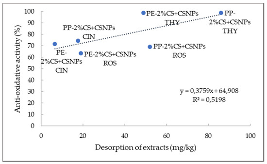 Complete inhibition was achieved with the application of thyme extract. Already after 15 min, both foils showed the maximum free-radical reduction. Moreover, high antiradical activity was obtained for PE and PP foils coated with rosemary and cinnamon extract. In the case of cinnamon–chitosan nanoparticles applied on PE foil (PE-2%CS + CSNP CIN), 48.23% inhibition was determined after 15 min, and 63.26% inhibition was determined after 1 h. Antioxidant activity of the same coating attached onto PP foil was a little bit higher (faster kinetics) than for PE foils (55.21% after 15 min and 69.31% after 1 h). This may be due to better adhesion or a higher amount of available extract on the surface. Similar antioxidative inhibition can also be observed for the application of chitosan nanoparticles with embedded rosemary extract (PE/PP-2%CS + CSNP ROS). It should be noted that CS/sodium tripolyphosphate (TPP) extract dispersions were applied as a second layer, and, because the extracts attached not only inside the particles, but also on the particle surfaces, this led to higher antiradical activity. The latter is also very much connected to the released amount of extracts (Figure 8), where solid correlation between antioxidative activity and desorption of extracts was noted (correlation coefficient of 0.5198). When antioxidative activity is correlated to the contact angle (Figure 9), it may be seen that the higher contact angle worsens antioxidant activity. This is also in accordance with the results of correlation between OTR and contact angle, where the same trend was obtained, i.e., a higher contact angle increases OTR. From this, it may be concluded that antioxidant activity is also reduced with higher oxygen permeability. The latter is logical, as the presence of oxygen causes oxidation processes which worsen storage conditions. However, the contrary may be seen for antimicrobial activity where more complex mechanisms are involved.