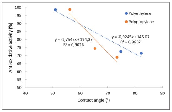 Correlation between contact angle and antioxidative activity for PE and PP foils.