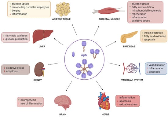 Pleiotropic effects of adiponectin. This figure summarizes the beneficial and protective effects of ApN on a variety of tissues and organs. Green arrows represent an increase, while red arrows represent a decrease. ApN, adiponectin as globular, trimeric, hexameric or multimeric forms (starting from left symbol and going in a clockwise direction). Created with BioRender.com.