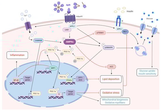 ApN exerts its metabolic effects on the skeletal muscle mainly by activating the AMPK signaling pathway (Figure 2). AMPK is a key sensor of cellular energy status, which plays a critical role in systemic energy balance. It is activated after phosphorylation by distinct upstream kinases such as liver kinase B1 (LKB1) or Ca2+/calmodulin-dependent protein kinase kinase beta (CaMKKβ).