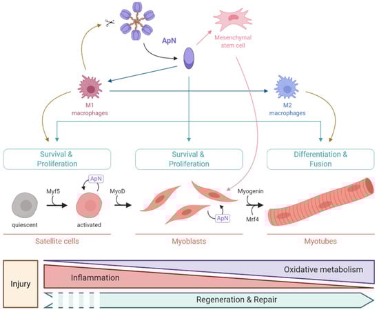 After injury, immune cells, including M1 macrophages, are recruited to the lesion site where they produce and release elastases that cleave native ApN into its globular ApN form (gApN) [8]. As gApN expression is low in the bloodstream, it is likely that most gApN is locally produced by muscle (satellite cells, differentiating myoblasts, ..) and acts in an autocrine or paracrine manner as a tissue regenerating hormone [66]. Both M1 macrophages and gApN play essential roles in the activation of satellite cells and the initiation of muscle regeneration [65,66]. Once activated, satellite cells will migrate, proliferate and give rise to myoblasts that differentiate into myotubes, which then fuse to restore damaged fibers or generate new one [64] (Figure 3).