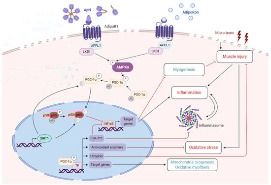 Mechanistically, the anti-inflammatory effects of ApN in human “healthy” myotubes were linked to activation of the AdipoR1-AMPK-SIRT1-PGC-1α pathway [56,57]. The AMPK pathway is known to inhibit inflammation and oxidative stress by repressing the activity of the transcription factor, nuclear factor kappa B (NF-κB), a key inducer of inflammatory responses [59]. Indeed, both PGC-1α and SIRT1 could repress NF-κB [60,61] (Figure 2). Moreover, we have recently identified a strong microRNA candidate, mir-711 for mediating the anti-inflammatory action of ApN on mouse and human skeletal muscles [62]. ApN up-regulated the expression of miR-711, which, in turn, also repressed NF-κB as well as the inflammasome complex [62,63]. Eventually, as mentioned earlier, PGC-1α is also a regulator of cellular oxidant–antioxidant homeostasis by stimulating gene expression of several antioxidant enzymes such as superoxide dismutase-2, catalase, and glutathione peroxidase [43].