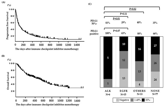In addition, it is not known whether the predictive factors of ICI treatment efficacy are equivalent between patients with and without driver oncogenes. In this study, a multivariate analysis detected that good PS (0–1), PD-L1 status (positive), mutation (without EGFR or ALK), and baseline C-reactive protein (CRP) value (<1.0 mg/dL) were significant factors for PFS following ICI treatment. There are some reports that ICI treatment has less efficacy in patients with a high CRP level. There are several reports, including our report, that ICI treatment has less efficacy in patients with poor PS or high CRP. It is thought that these are due to immunosuppression and the relationship with inflammatory cytokines [31,32,33], but the reasons are not clear. Therefore, CRP is not a clear biomarker. However, PD-L1 expression, one of the biomarkers of ICI treatment, is important when determining the course of treatment [24,25]. We do not know whether PD-L1 is a suitable biomarker for patients with EGFR or ALK mutations. In this study, we found that the correlation between PD-L1 expression and the effect of ICI treatment was not strongly associated in patients with ALK rearrangement, in spite of the small population included in the study.