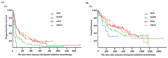 ALK gene rearrangement occurs in a small portion of patients with non-small-cell lung cancer (NSCLC) [5], but it accounts for about 30%–40% of lung adenocarcinoma in young individuals, and is present in many non-smokers and patients with epidermal growth factor receptor (EGFR)-mutated lung cancer [6,7,8]. ALK tyrosine kinase inhibitors (TKIs) are effective in NSCLC patients with ALK gene rearrangement. Crizotinib, a first-generation ALK inhibitor that was originally developed as a c-Met inhibitor, also potently inhibits ALK kinase [9,10]. Crizotinib showed clinical benefit for NSCLC patients with ALK rearrangement beyond cytotoxic chemotherapy in the PROFILE 1007 trial and PROFILE 1014 trial, and has been approved and used in clinical practice [9,10]. However, after the initial positive response, all patients developed resistance to crizotinib after approximately one year. The most frequent resistance mechanism is the L1196M gatekeeper mutation, but resistance mechanisms of ALK inhibitors are more diverse than those of EGFR TKIs [11,12,13]. Second-generation ALK inhibitors have been developed as effective drugs for ALK-positive NSCLC patients who have acquired resistance, such as alectinib, which has shown remarkable efficacy after acquired resistance to crizotinib in clinical trials [14]. To answer the question of whether sequential treatment with alectinib after crizotinib is better than alectinib for ALK-positive NSCLC as an initial treatment, alectinib and crizotinib were previously compared as a first-line treatment for ALK-positive NSCLC. The results showed that alectinib was superior to crizotinib as a first-line treatment for ALK-positive NSCLC [15,16]. However, resistance to alectinib eventually developed. Moreover, the resistance mechanism of alectinib has been reported to be more diverse than that of crizotinib [17]. Approximately 30% of resistance to ALK inhibitors is due to gene mutations, but the new acquired resistance mechanisms are diverse [18]. Attempting to overcome resistance by focusing on resistant mutated genes is not a common treatment strategy [19]. Therefore, cytotoxic chemotherapy and immune therapy are needed to treat patients who develop resistance to ALK inhibitors. Treatment after acquired resistance to ALK inhibitors include other ALK inhibitors, but an immune checkpoint inhibitor (ICI) + chemotherapy, which is the standard first-line treatment for NSCLC without a driver oncogene, is a candidate for ALK inhibitor resistance. However, there is less data on the efficacy of ICIs for ALK-rearranged NSCLC. Among the clinical trials for ICI + chemotherapy, those including ALK- and EGFR-positive cases have reported the use of atezorizumab + bevacizumab + carboplatin + paclitaxel (ABCP) (IMPOWER 150 trial). For EGFR/ALK-positive cases, ABCP showed a 70.6% objective response rate (ORR), and ABCP was superior to BCP in progression-free survival (PFS) and overall survival (OS) in a subgroup analysis (PFS—hazard ratio (HR): 0.59, 95% confidence interval (CI): 0.37–0.94; OS—HR: 0.54, 95% CI: 0.29–1.0). However, only 11 ALK-positive cases were included in the IMPOWER 150 trial [20]. Similarly, there are a few reports of ALK-positive NSCLC with ICI monotherapy [21,22]. Additionally, in many clinical trials, ALK and EGFR are administered in combination. Although the backgrounds of patients who have EGFR- and ALK-positive tumors commonly include non-smokers and young patients [6,7,8], it is unclear whether a similar clinical course is followed in immunotherapy. It has been reported that programmed death-ligand 1 (PD-L1) expression is high in ALK-positive lung cancer [23,24]. PD-L1 expression is one of the predictors of efficacy for ICI treatment [25,26]. However, there are a few reports of studies that have investigated the efficacy of PD-1 inhibitors in ALK-rearranged NSCLC patients [21,22]. Therefore, we compared the efficacies of ICIs for the treatment of lung adenocarcinoma with ALK rearrangement and other oncogene drivers, including EGFR mutations.