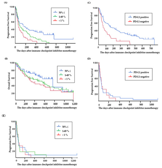 Clinical outcomes in patients treated with ICI. (A) Progression-free survival and (B) overall survival based on PD-L1 status in all patients viable for PD-L1 assessment (N = 151). (C) Progression-free survival based on PD-L1 status in patients without EGFR or ALK mutations (N = 141) and (D,E) with EGFR or ALK mutations (N = 54).