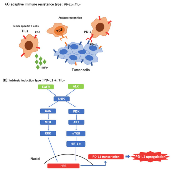 Different types of tumor microenvironment in PD-L1-positive tumors. (A) Adaptive immune resistance type: Tumor Infiltrating Lymphocyte (+); (B) Intrinsic induction type: Tumor Infiltrating Lymphocyte (−)