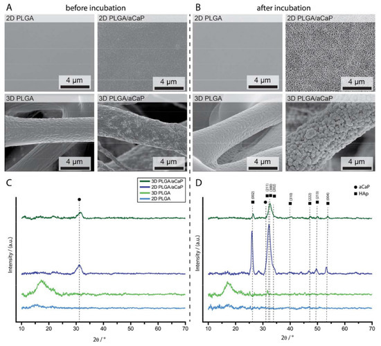 SEM images of the surface of poly(lactic-co-glycolic acid) (PLGA) and amorphous calcium phosphate nanoparticles (PLGA/aCaP) fabricated as films or electrospun meshes (A). On the surface, the films made of PLGA are flat, in contrast to the PLGA/aCaP films, where the nanoparticles can be seen quite well (increased magnification in Figure S1). The surface of the scaffolds was analyzed by means of SEM after (B) incubation for 2 weeks in DMEM at 37 °C (B). Hydroxyapatite crystals can be observed on 2D and 3D PLGA/aCaP scaffolds. The formation of hydroxyapatite on material with incorporated aCaP nanoparticles was confirmed by X-ray diffraction (XRD) pattern ((C): before incubation; (D): after incubation) [35]. The black dot denotes the aCaP phase.