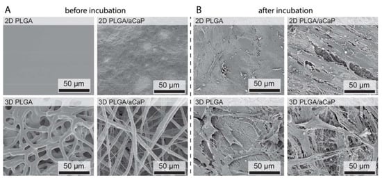 The 2D and 3D scaffolds of PLGA and PLGA/aCaP, shown without cells in (A), were seeded with adipose-derived stem cells for 14 days, shown in (B). The interaction between cells and material seems to be enhanced on scaffolds containing calcium phosphate compounds because of aCaP nanoparticles and newly formed hydroxyapatite (Hap), while biofilm formation is observed on pristine PLGA rather than adhesion of the cells as found for PLGA/aCaP.