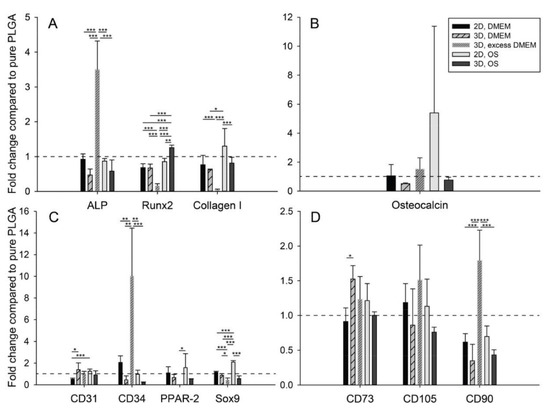 Manifold gene expression of human adipose-derived stem cells (ASCs) seeded on PLGA or on PLGA/aCaP realized as casted films or as electrospun random fiber meshes. The fold change of aCaP-seeded PLGA compared to pure PLGA is shown in (A) ALP, Runx2 and collagen I, (B) osteocalcin, (C) CD31, CD34, PPAR-γ-2 and Sox9, (D) CD 73, CD105 and CD 90. Values at 1.0 (dashed line) indicate no change in gene expression, whereas higher values indicate enhanced gene expression if aCaP nanoparticles are present. Key: OS = osteogenic medium. The p-values of pairwise comparison of one-way ANOVA statistics were considered significant if p < 0.05, denoted by *. **, p < 0.01; ***, p < 0.001. For significant differences between PLGA/aCaP and PLGA, we refer to SI Figures S1 and S2.