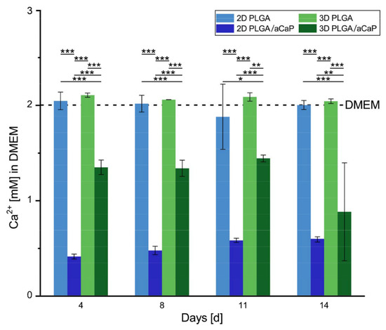 As a further step, cell-free 2D films and 3D electrospun meshes of PLGA ± aCaP nanoparticles were incubated in DMEM to gain further insights into the interaction between the medium and material itself (no cells present). The concentration of free calcium ions in the supernatant was measured before and after every medium change (Figure 4). The Ca2+ concentration in the supernatant of calcium phosphate-containing composites was reduced significantly after incubation at 37 °C for up to 14 days (medium change time interval: 3 or 4 days), while pristine PLGA did not indicate any change compared to the basal concentration in the medium.