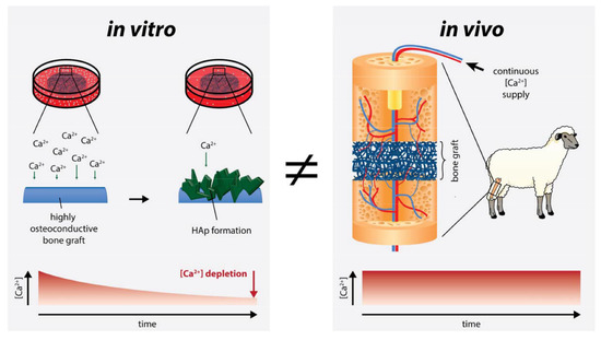 Studying potential bone grafts is often performed under in vitro conditions. Highly osteoconductive materials lead to the rapid formation of calcium phosphate crystal hydroxyapatite (HAp). In consequence, the free calcium ion in the medium depletes. In such cases, in vitro studies are not able to mimic in vivo conditions anymore, since continuous supply of minerals, such as Ca2+, is given by diffusion under in vivo conditions.