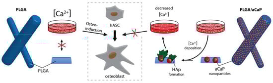 In our previous work, we focused on a nanocomposite based on poly(lactic-co-glycolic acid) (PLGA) and amorphous calcium phosphate nanoparticles (PLGA/aCaP, weight ratio 60:40) seeded with human adipose-derived stem cells (ASCs) [11,30,31,32]. Moreover, the gene expression of primary human ASCs seeded on a thin casted film made of either PLGA or PLGA/aCaP or on electrospun random fiber meshes (PLGA or PLGA/aCaP) was assessed to investigate the effects of the structure and material composition [33].