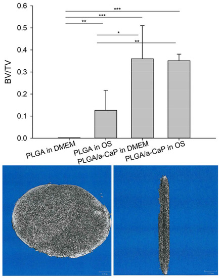 The bone volume (BV)/total volume (TV) (= bone volume fraction) is given for the two different materials (PLGA and PLGA/aCaP) in the two different culture media (DMEM and osteogenic medium = OS). The bone volume fraction (BV/TV) was assessed for the ASC-seeded three-dimensional random fiber meshes after 14 days cultured in vitro (see Materials and Methods). Below, there are typical micro-CT images of a PLGA scaffold: surface (left) and cross-section (right), scale bars = 1 mm. The p-values of pairwise comparison of one-way ANOVA statistics were considered significant if p < 0.05, denoted by *. **, p < 0.01; ***, p < 0.001.