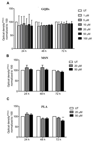 Profile of cell viability of breast cancer cells exposed to a range of nanopolymers concentrations. MDA-MB-231 breast cancer cells were treated with (A) graphene quantum dots (GQDs), (B) mesoporous silica nanoparticles (MSN) or (C) polymeric lactic acid (PLA) for 24, 48 and 72 h. The MTT assay was performed and optical density was obtained at 570 nm. The graphs represent the mean ± standard deviation from three independent experiments. UT: Untreated cells. Statistical significance was analyzed by the one-way ANOVA test (* p < 0.05; ** p < 0.01).