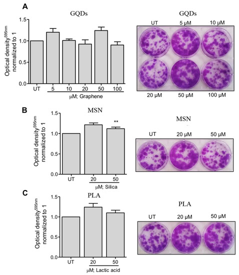 Clonogenicity capacity following treatment of breast cancer cells with a range of (A) graphene quantum dots (GQDs), (B) mesoporous silica nanoparticles (MSN) or (C) polymeric lactic acid (PLA) concentrations. MDA-MB-231 breast cancer cells were treated with nanopolymers for 24 h, after which fresh media was replaced in plates. After colony formation, cells were stained with crystal violet. Colonies were dissolved and optical density was measured at 595 nm. The graphs represent the mean ± standard deviation from three independent experiments. UT: Untreated cells. Statistical significance was analyzed by the Student´s t test (* p < 0.05; ** p < 0.01).