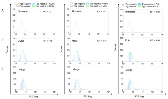 P-glycoprotein (Pgp) expression profile in nanopolymer-treated breast cancer cells. MDA-MB-231 cells were treated with 50 µM graphene quantum dots (GQDs), mesoporous silica nanoparticles (MSN) or polymeric lactic acid (PLA) for 72 h and had P-gp expression compared with untreated cells (A,B). Cells were stained with PE-conjugated Pgp monoclonal antibody (UIC2, Coulter, USA) and evaluated by flow cytometry. For better visualization of differences between untreated and nanopolymer-treated cells, histograms were merged (C). The results were expressed by Relative Fluorescence Intensity (RFI), calculated by the ratio between the fluorescence intensity in cells treated with UIC2 and the fluorescence intensity in cells.