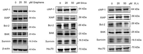Based on the available literature, there are many proteins involved in various cellular pathways that have been associated with cancer drug resistance [40,79]. Therefore, we also evaluated the effects of the different nanomaterials on the expression levels of some proteins with established role in drug resistance. The proteins which were investigated in this study include cIAP-1, XIAP, Bcl-2, BAK and Survivin. For loading control levels of β-actin or Hsc70 were determined as well. MBA-MD-231 cells were treated with 20 µM and 50 µM of GQDs, MSN or PLA for 72 h and the levels of chemoresistance related proteins were determined using immunoblot analysis. As shown in Figure 4, expression levels of most of the proteins including cIAP-1, Bcl-2, BAK and Survivin did not appear to change significantly after treatments with all three types of nanomaterials. However, XIAP protein levels were reduced with 50 µM of GQDs whereas 20 µM and 50 µM treatment of PLA appears to increase the expression levels.