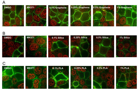 Effect of nanopolymer treatments on MRP1 efflux activity. Doxorubicin accumulation assay was used to measure MRP1 efflux activity. HEK293T cells transiently transfected with MRP1-GFP (green) were pre-treated with 0.1%, 0.25%, 0.5%, 1% Graphene (quantum dots) (A), (mesoporous) Silica (B), PLA nanoparticles (C) or 50 μM of MK571 (known MRP1 inhibitor), before incubation with doxorubicin (red) at 37 °C for 1 h. Images were acquired using confocal microscopy. GFP and doxorubicin were excited at 488 nm, and emission detected at 475/42 and 605/64 nm, respectively.