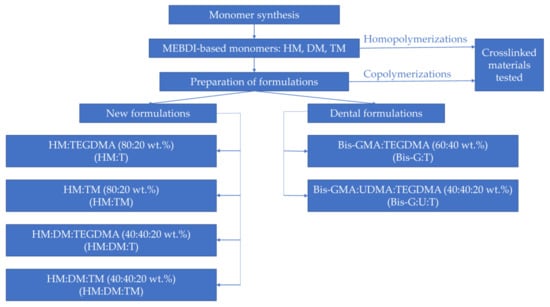 The obtained MEBDI-based monomers were compounded with themselves and TEGDMA to prepare four new formulations (Table 1). Two of them were solely composed of the MEBDI-based monomers (HM:TM and HM:DM:TM). In a second pair (HM:T and HM:DM:T), TM was replaced with TEGDMA, a reactive diluent typically used in dental materials. TEGDMA and TM were in a 20 wt.%. For two further samples, HM was diluted with DM at a 1:1 weight ratio. For comparison purposes, two typical dental formulations were prepared. They consisted of Bis-GMA and TEGDMA, mixed in the 60:40 weight ratio (Bis-G:T), and Bis-GMA, UDMA and TEGDMA, mixed in the 40:40:20 weight ratio (Bis-G:U:T).