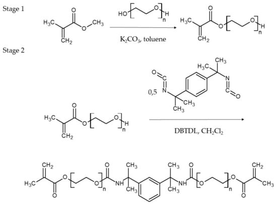 A 50 wt.% solution of HEMA (26.14 g, 0.20 mol) in methylene chloride, admixed with DBTDL (0.03 wt.%, the catalyst) and PTZ (500 ppm, the inhibitor), was placed in a 250 mL three-neck flask equipped with a mechanical stirrer, thermometer, dropping funnel and condenser. The reaction mixture was heated to 40 °C, and the 50 wt.% solution of MEBDI (24.42 g, 0.10 mol) in methylene chloride was added dropwise for 1 h, maintaining the temperature at 40 °C. Stirring was continued for 3 h at 40 °C. After cooling, the methylene chloride was evaporated under vacuum (first at 30 mbar and then at 3 mbar). HM (Scheme 2) was obtained with a 100% yield. The product was a highly viscous resin with a very slight straw color.
