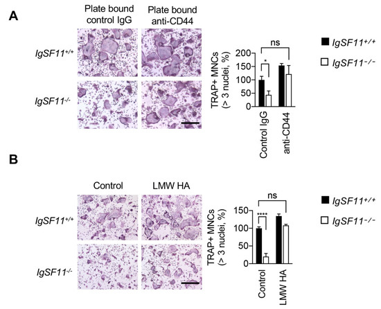 To further investigate the interrelationship between CD44 and IgSF11 in osteoclasts, we examined the effect of CD44 stimulation on IgSF11−/− cells. We employed plate-bound (rather than blocking/neutralizing soluble) anti-CD44, since immobilized antibody can cross-link and stimulate CD44-dependent signaling. IgSF11+/+ and IgSF11−/− BMMs were cultured on plate-bound anti-CD44 at low cell density, and cultured with M-CSF + RANKL to induce differentiation to osteoclasts. Stimulation with anti-CD44 rescued impaired TRAP+ multinucleated cell formation in IgSF11−/− cultures (Figure 2A). CD44 has multiple ligands, including low-molecular-weight hyaluronan (LMW-HA), which has been shown to stimulate osteoclast formation [21]. We stimulated low-cell-density IgSF11+/+ and IgSF11−/− cultures with LMW-HA and found that LMW-HA rescued TRAP+ multinucleated cell formation in IgSF11−/− cultures (Figure 2B). These results showed that CD44 stimulation could rescue the effects of IgSF11 deficiency in osteoclasts, and suggested that CD44 can act in an IgSF11-independent manner.