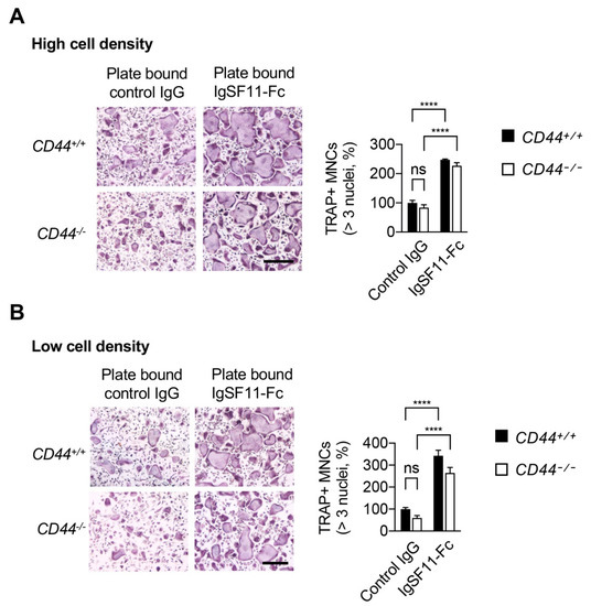 Next, we examined the effect of IgSF11 stimulation on CD44-deficient (CD44−/−) cells. As we reported previously, IgSF11 engages in homophilic interactions, and adding recombinant soluble IgSF11-Fc protein that consists of the extracellular region of IgSF11 fused to the human IgG Fc region blocked osteoclast differentiation in a dose-dependent manner (Figure S3) [14]. We therefore employed plate-bound recombinant IgSF11-Fc protein to instead stimulate IgSF11 (Figure 3). CD44+/+ and CD44−/− BMMs were cultured at high cell density (Figure 3A) or low cell density (Figure 3B) on plate-bound IgSF11-Fc with M-CSF + RANKL. Although CD44 deficiency did not result in significant reduction of TRAP+ multinucleated cell formation at either cell density (Figure 3A,B), stimulation with IgSF11-Fc dramatically enhanced formation of TRAP+ multinucleated cells in both CD44+/+ and CD44−/− cultures (Figure 3). These results suggested that direct stimulation of IgSF11 is capable of exerting a pro-osteoclastogenic effect in a CD44-independent manner, and that CD44 deficiency alone does not negatively impact in-vitro osteoclast differentiation.