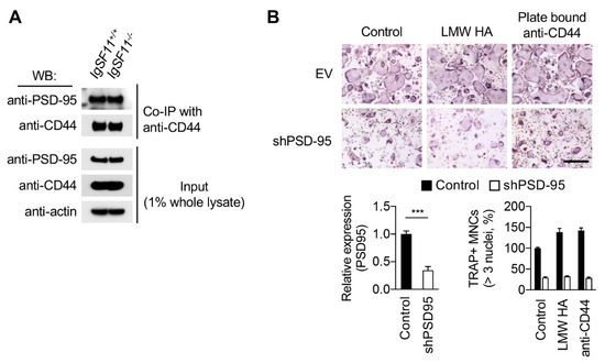 We sought to further investigate the molecular mechanism underlying the interrelationship between IgSF11 and CD44 in osteoclasts. Given the requirement for association between IgSF11 and PSD-95 during osteoclast differentiation [14] and the capacity of CD44 to compensate for IgSF11 deficiency, we hypothesized that CD44 may functionally associate with PSD-95 during osteoclast differentiation. To examine the association of CD44 with PSD-95, BMMs were cultured with M-CSF + RANKL for two days to induce pre-osteoclasts, and the lysates were used for coimmunoprecipitation. Association of PSD-95 with CD44 was detected in wild-type cultures (Figure 4A), and also detected in IgSF11−/− cultures (Figure 4A), suggesting that CD44 associates with PSD-95 independently of IgSF11. To further examine the involvement of PSD-95 in CD44-mediated regulation of osteoclast differentiation, BMMs were retrovirally transduced with shRNA encoding PSD-95 to knock down expression of PSD-95, followed by stimulation of CD44. As previously reported, RNAi-mediated knockdown of PSD-95 inhibits osteoclast differentiation (Figure 4B) [14]. Neither stimulation with plate-bound anti-CD44 nor treatment with LMW-HA showed stimulatory effects on osteoclast formation in PSD-95 knockdown cultures (Figure 4B). These results suggested that PSD-95 is required for CD44-mediated osteoclast differentiation.