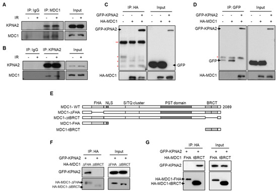 To explore the molecular mechanism by which MDC1 regulates DDR signaling, we performed a yeast two-hybrid screen using the C-terminal fragment (amino acids 1882–2089) of human MDC1 as the bait and looked for novel protein interactions. One of the positive clones isolated from the 2 × 106 transformants was a nuclear transporter, KPNA2 [1]. To determine whether the interaction between MDC1 and KPNA2 was relevant in the context of a cell, we performed immunoprecipitation assays. HeLa cells were treated with Ionizing Radiation (IR) to induce DSBs, and then endogenous MDC1 was immunoprecipitated using an MDC1-specific antibody. Immunoprecipitates were analyzed using Western blotting with either anti-KPNA2 or anti-MDC1 antibodies. Analysis with anti-MDC1 antibody showed an interaction between MDC1 and KPNA2, and treatment with IR did not significantly change the amount of MDC1 that bound to KPNA2 (Figure 1A). A reciprocal assay using anti-KPNA2 antibody confirmed this interaction (Figure 1B). When normal rabbit IgG was used as a negative control, neither MDC1 nor KPNA2 precipitated, indicating that the interaction between MDC1 and KPNA2 was specific. This result with endogenous proteins was corroborated using exogenous proteins in a reciprocal co-immunoprecipitation assay using Hemagglutinin (HA)-tagged MDC1 and Green fluorescent protein (GFP)-tagged KPNA2 (Figure 1C,D). These results support the prediction that there is an intracellular interaction between MDC1 and KPNA2.