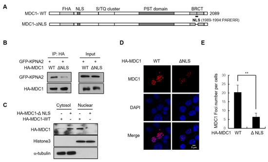 Figure 3. Identification of functional NLS in MDC1. (A) A schematic representation of HA-tagged wild-type MDC1 (MDC1-WT) and NLS-deleted HA-MDC1 (MDC1-ΔNLS). Putative nuclear localization signal (NLS, PARERR) is shown. (B) GFP-KPNA2 were transfected into HEK293T cells along with HA-MDC1-WT or HA-MDC1-ΔNLS. Whole cell lysates were then subjected to immunoprecipitation using anti-HA antibody, followed by Western blotting using indicated antibodies. (C) HeLa cells were transfected with MDC1-WT or MDC1-ΔNLS, and the cytosol and nuclear fractions were isolated. The cytosol and nuclear extracts were subjected to Western blotting using indicated antibodies. (D,E) MDC1-WT or MDC1-ΔNLS-transfected HeLa cells were irradiated with IR and the number of IR-induced HA-MDC1 foci was calculated. Representative images (D) and quantification (E) of HA-MDC1 foci are shown. Scale bar; 5 μm. Data represent mean ± SD (n = 3), ** p < 0.01.