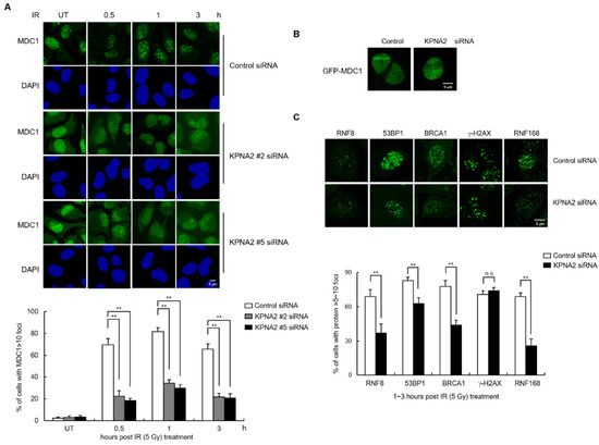 Because we observed that KPNA2 was involved in MDC nuclear import, we predicted that KPNA2 might regulate the DDR pathway by promoting MDC1 function. To verify this, control and KPNA2 knockdown cells were irradiated with IR and the number of MDC1 foci was measured at subsequent time points. We found that MDC1 foci formation was significantly reduced in KPNA2 deficient cells over 0.5, 1, and 3 h after irradiation compared to control cells (Figure 4A). Quantification of the data indicated that the percentage of KPNA2 knockdown cells containing more than 10 foci of MDC1 remained at only ~25–30%, whereas for control cells, this number had risen to ~75%. To further explore the effect of KPNA2 on the MDC1 foci formation, control and KPNA2 knockdown cells were transfected with GFP-tagged MDC1 and then laser-microirradiated with 405-nm laser to induced DSBs and allowed to recover for 5 min. Consistently, the accumulation of GFP-MDC1 at the site of laser microirradiation was markdedly reduced in KPNA2 depleted cells (Figure 4B). MDC1 is required for the retention of additional DDR proteins at DNA damage sites; thus, it is considered an upstream regulator of the DDR [4,18,19]. Therefore, we predicted that KPNA2 depletion would also affect nuclear localization of other DDR factors to DSB sites. To test this hypothesis, we monitored IR-induced nuclear foci formation for RNF8, 53BP1, BRCA1, γ-H2AX, and RNF168 in the presence or absence of KPNA2. Results indicated that depletion of KPNA2 resulted in fewer foci for four of these proteins, RNF8, 53BP1, BRCA1, and RNF168 (Figure 4C), similar to what had been previously observed for MDC1-deficient cells. On the other hand, γ-H2AX, a protein that acts upstream of MDC1 in the DDR pathway, was unaffected by the presence or absence of KPNA2. Together, these data suggest that KPNA2-mediated MDC1 nuclear translocation is particularly important for DNA damage signaling regulated by MDC1, since the recruitment of both MDC1 and its downstream proteins are critical for DDR.