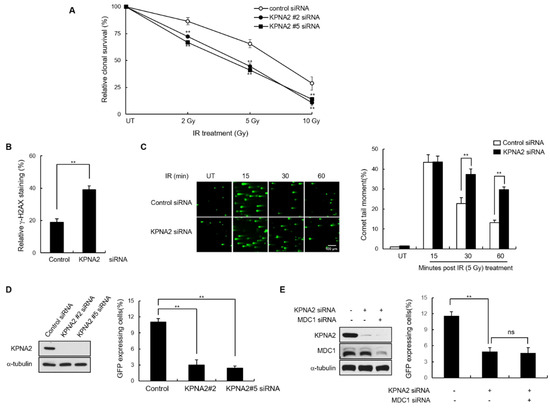 Figure 5. KPNA2 promotes HR repair. (A) Control and KPNA2-depleted HeLa cells were exposed to the indicated dose of IR and assessed for colony forming ability. The cell viability of untreated cells is defined as 100%. Data presented as mean ± s.d. (B) Control and KPNA2-depleted HeLa cells were exposed to IR. After 24 h, immunostaining was performed using γ-H2AX antibody. The percentage of cells containing >10 γ-H2AX foci was then calculated. Data are presented as means ± s.d. (C) Control and KPNA2-depleted HeLa cells were untreated or treated with 5 Gy γ-irradiation. At the indicated time points, cells were harvested to carry out comet assay under neutral condition. Comet images were captured using fluorescence microscopy, and comet tail moment was analyzed using Komet 5.5 analysis software. Representative comet images obtained at different time points are shown. Scale bar; 100 μm. Changes in the tail moments between control and KPNA2 knockdown cells after IR treatment are represented in histogram. Data presented as mean ± s.d. (D,E) DR-GFP-U2OS cells transfected with the indicated siRNA combinations. The level of endogenous KPNA2 and MDC1 were analyzed by Western blotting (left). The GFP-positive cells were measured by Fluorescence-activated cell sorting (FACS). Data represent mean ± s.d. (n = 3), ** p < 0.01. ns, not significant.