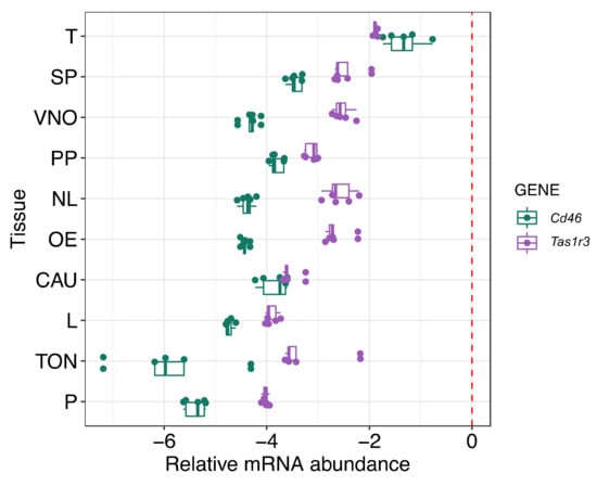 Total RNA was isolated from ten different tissues (vomeronasal organ (VNO), main olfactory epithelium (OE), nasal-associated lymphoid tissue (NL), preputial gland (PP), prostate (P), cauda epididymis (CAU), testes (T), spleen (SP), liver (L) and tongue (TON)) of C57BL/6 males, nmale = 5. RNA isolation was performed using TriReagent solution (Sigma-Aldrich) according to standard chloroform/isopropanol protocol (https://www.sigmaaldrich.com/technical-documents/protocols/biology/tri-reagent.html) and followed by DNase protocol (Fermentas, Waltham, MA, USA) to avoid potential DNA contamination. cDNA was synthetized with RevertAid M-MulV Reverse Transcriptase using Oligo (dT) primers (First-strand cDNA synthesis kit, Fermentas). Quantitative PCR (qPCR) was performed on LightCycler480 using SYBR Green I Master chemistry according to manufacturer’s protocol (Roche Applied Sciences, Penzberg, Germany). Primers were designed as intron spanning assay and the sequences are as follows: GapdhF-5′ ATG GTG AAG GTC GGT GTG A 3′, GapdhR-5′ AAT TCT CCA CTTTGC CAC TGC 3′, Cd46F-5′ AGC CCT CCG GAG TGT AAA GT 3′, Cd46R-5′ ACA TCA CTG TTG ATT GAT AGG AAA AT 3′, Tas1r3F-5′ ACA GGT TCT CAC CCC TTG G 3′, Tas1r3R-5′ TCT CCT CCA CAG CCA TCT TC 3′. Each sample ran as triplicate; non-template and non-RT reactions were used as controls. Conditions of qPCR amplification were optimized to: initial denaturation at 95 °C for 10 min, followed by 35 cycles consisting of denaturation at 95 °C for 10 s, annealing at 56 °C for 10 s and extension step at 75 °C for 10 s. After the cycles were completed, we set up the melting analysis to check the specificity of the amplification. The Cp value was obtained for each sample and triplicate variation was controlled to not exceed standard deviation 0.5 Cp. Average values of triplicates were than used to calculate relative expression according to the housekeeping gene (Gapdh). Because the expression of target genes (Cd46, Tas1r3) was in some tissues much lower than the expression of the housekeeping gene, we used logarithmic scale (Log10) for data visualization in the graph (Figure 1).