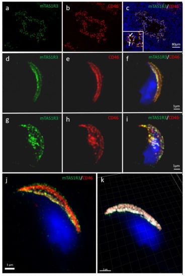 Localization of mTAS1R3 (green) and CD46 (red) in mouse sperm revealed by Confocal Microscopy and Structure Illumination Microscopy (SIM). During spermiogenesis (a) mTAS1R3 (green) and (b) CD46 (red) are localized in elongated and late spermatids with a formed acrosome (c) both proteins colocalize (yellow); for details, see enlarged area and white arrows pointing to the spermatids. (d) In epididymal sperm, mTAS1R3 (green) is present in the apical acrosome specifically in the acrosomal membranes and corresponds to (e) CD46 (red) localization. (f) The colocalization of both mTAS1R3 and CD46 pattern (yellow) is shown in acrosomal membranes defining the intact acrosome overlaying the nucleus (blue). (g) During the acrosome reaction mTAS1R3 (green) relocates into the equatorial segment, as well as (h) CD46 (red) and (i) their colocalization (yellow) is shown with nucleus (blue) overlay. (j) SIM imaging shows precise localization of mTAS1R3 (green) in the acrosomal membranes. (k) Huygens software was used for better visualization of mutual position of mTAS1R3 (green) and CD46 (red) in acrosomal cap area. White color shows the place of colocalization with CD46. CD46 was used as a marker of the acrosomal membranes. Scale bars represent (a–c) 80 μm, (d–j) 1 μm, (k) 2 μm.