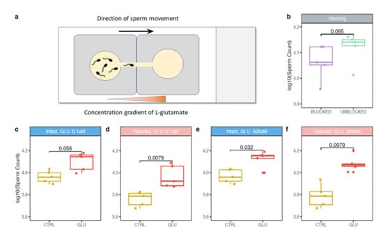 For this experiment, epididymal acrosome-intact and acrosome-reacted sperm of C57BL/6 males, nmale = 5, were prepared as described above in 4.4. and a glass slide with two SecureSeal imaging spacers (Sigma-Aldrich) were used. In both imaging spacers, a thin line (approximately 1 mm) between the well and the edge was cut out and imaging spacers were adhered on the glass slide with cut lines next to each other forming a bridge connecting the two wells. M2 media with two different concentrations (500 μM and 0.1 μM) of L-glutamate (G-1501, Sigma-Aldrich) were prepared. Wells were filled with 100 μL of M2 medium containing 4 μL released spermatozoa and with 100 μL of L-glutamate, in the case of negative control with 100 μL of pure M2 medium without glutamate. Wells were then carefully connected through the bridge by a pipette tip in the direction from glutamate drop to avoid a passive drag of sperm to glutamate. After 5 min, the drop with glutamate (or with pure M2 medium) was collected and sperm counted in Bürker chamber (3–5 main squares were analyzed). Every measurement was repeated three times. To compare the counted numbers from each individual, counts were recounted according to the initial concentration of the used spermatozoa. Throughout the experiment, the sperm and glass slide were kept in the incubator. We used M2 medium and glutamate were prewarmed. Sperm viability and motility was checked at the beginning and at the end of each experiment under the light microscope.