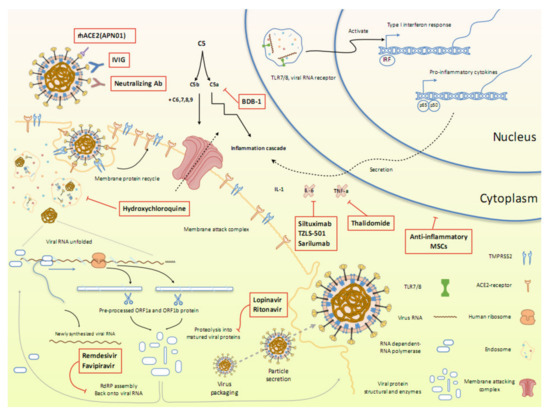 Currently, there is not sufficient evidence that any existing antiviral drugs can efficiently treat COVID-19 pneumonia. However, there are several clinical trials on potential antiviral therapies taking place. The therapies can be divided into two categories depending on their target. One is acting on the coronavirus directly, either by inhibiting crucial viral enzyme responsible for genome replication, or by blocking viral entry to human cells. The other is designed to modulate the human immune system, either by boosting the innate response, which has a particularly important role against viruses, or by inhibiting the inflammatory processes that cause lung injury. Most of these drugs were originally designed for other pathogens and were promptly repurposed for the current COVID-19 trials. At the same time, several trials were initiated to test the specific vaccines and antibodies specifically targeting SARS-CoV-2. Here, we summarize the ongoing therapeutic options that may lead us to combating the novel pathogen (Figure 2).