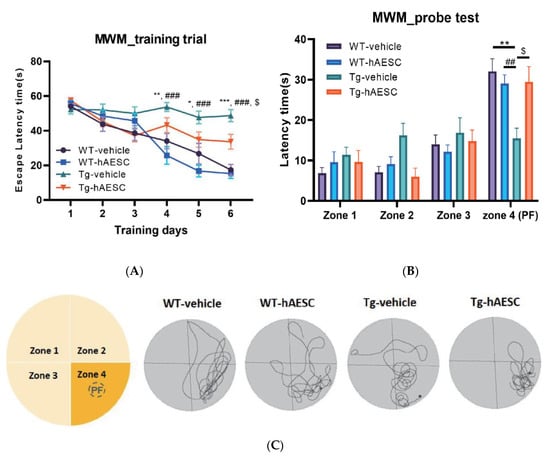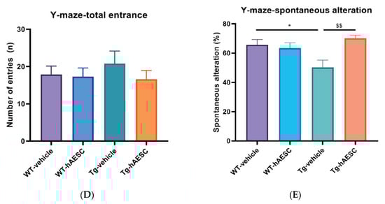 2.2. Transplantation of hAESCs Alleviates Cognitive Deficits in Tg2576 Alzheimer’s Disease Transgenic Mice