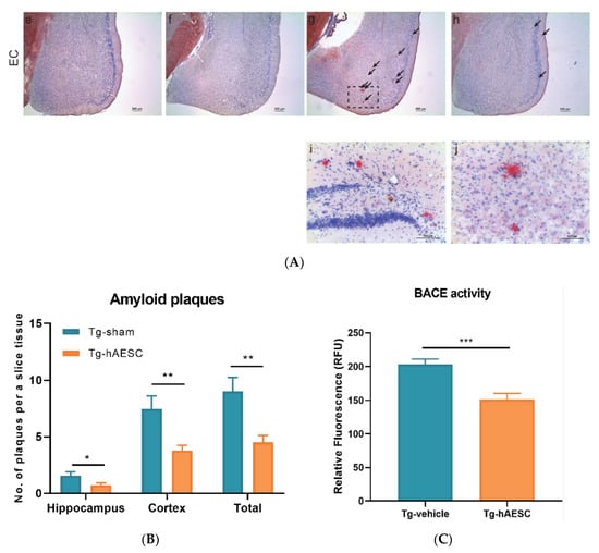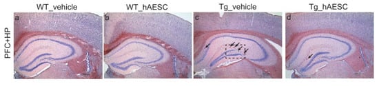 2.3. Transplantation of hAESCs Reduces Amyloid Burden in Tg2576 Alzheimer’s Disease Transgenic Mice