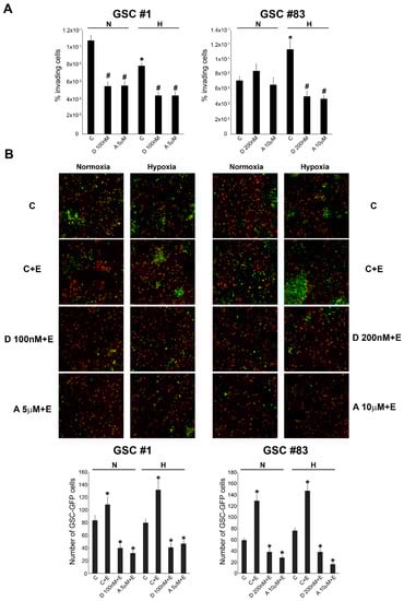 - Joseph, J.V.; Conroy, S.; Pavlov, K.; Sontakke, P.; Tomar, T.; Eggens-Meijer, E.; Balasubramaniyan, V.; Wagemakers, M.; den Dunnen, W.F.; Kruyt, F.A. Hypoxia enhances migration and invasion in glioblastoma by promoting a mesenchymal shift mediated by the HIF1α-ZEB1 axis. Cancer Lett. 2015, 359, 107–116. [Google Scholar] [CrossRef]