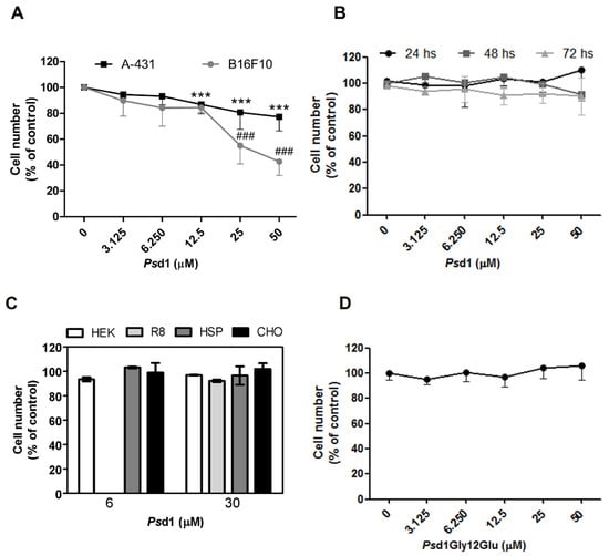 Psd1 has cytotoxic activity against tumor cells but not against healthy cells in vitro by the MTT assay. Cells lines (5 × 104 cells/well) were treated with different concentrations of Psd1 (3.125, 6.25, 12.5, 25, and 50 µM). Data were normalized against the untreated control, which was arbitrarily assigned as 100% cell viability. (A) A-431 and B16F10 cells were treated with Psd1 for 24 h. Both tumor cell lines had a significant reduction in viability in a dose-dependent manner. (B) Healthy Beas-2B cells were treated with Psd1 for 24, 48, and 72 h. No significant difference was observed at any time tested. (C) Cell viability of different mammalian health lineages by (lactate dehydrogenase) LDH release after incubation with Psd1 for 3 h. Values are the mean ± SEM of two experiments performed in triplicate. Psd1 at concentration of 6 µM was not tested against R8 cells. (D) B16F10 cells were incubated with Psd1 Gly12Glu for 24 h. The mutant did not show cytotoxic activity against this lineage. (A,B,D) Values are the mean ± SEM of two independent experiments performed in triplicate. Statistical significance was determined using one-way ANOVA with Dunnett’s multiple comparison test compared to cells without treatment. *** p < 0.001 for A431 cells in the presence of 12.5 µM, 25 µM, or 50 µM Psd1 and ### p < 0.001 for B16F10 cells in the presence of 25 µM or 50 µM Psd1.