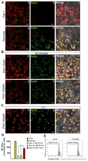 Psd1 promotes B16F10 live cell membrane permeabilization as monitored by SYTOX Green fluorescence. (A) Psd1 untreated and hydrogen peroxide-treated B16F10 cells. (B) A total of 1.5 × 104 B16F10 cells were incubated with 3 or 50 µM Psd1 for 30 min. (C) 1.5 × 104 B16F10 cells were incubated with 50 µM Psd1 for 1 h. All experiments were performed at 37 °C. Nucleus staining is shown in green (SYTOXGreen), and mitochondria are shown in red (MitoTracker Red CMXRos). Images are shown at 20× magnification. (D) Mean fluorescence intensities (MIF) of SITOXGreen fluorescence signals showed in (A, b,e), (B, b,e), and (C, b) per cell number are time-dependent. ****, p < 0.0001 treatment with 50 µM of Psd1 for 1 hour when compared with treatments with 3 and 50 µM of Psd1 for 30 min; letter a, p < 0.0001 treatments with peroxide and Psd1 when compared with the absence of Psd1 using one-way ANOVA and Bonferroni’s multiple comparison test. (E) Psd1 induces apoptosis in B16F10 cells. B16F10 cells were treated with 50 µM Psd1 for 24 h and labeled with propidium iodide, and the DNA content was analyzed by flow cytometry for the sub-G0/G1 profile. At least two independent experiments were performed.