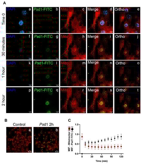 The entrance of Psd1-FITC in the B16F10 live cells in real time was observed using spinning disk confocal fluorescence microscopy (Figure 3). Before the addition of Psd1 (time zero), B16F10 cells showed good plate adherence with nuclei well stained in blue (DAPI) and several mitochondria in red (MitoTracker Red CMXRos) (Figure 3A, a/c-d), indicating cell viability and normal mitochondrial transmembrane potential. No background concerning FITC signal was detected (Figure 3A, b). Then, 9 µM Psd1-FITC was added, and the same cell field was photographed for 2 h. After 30 min, it was possible to detect few and faint green fluorescence signals in the nuclei, suggesting the entrance of Psd1 in those cells (Figure 3A, g). The relative fluorescence of Psd1-FITC increased after 1 h (Figure 3A, l). Psd1-FITC fully accumulated in the nucleus after 2 h of treatment, where intense bright green fluorescent points were detected (Figure 3A, q). The nuclear location of Psd1 was confirmed by merging the FITC and DAPI signals detected in merge and orthogonal views, as shown in the right panels (Figure 3A, i, n, s (merge) and j, o, t (ortho)). Moreover, over time, it was possible to detect a decrease in the red fluorescence intensity at real time (Figure 3A, c, h, m and r).
