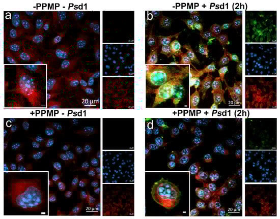 The image in Figure 4b (−PPMP, +Psd1 (2 h)) clearly showed that in the absence of PPMP, FITC-Psd1 was internalized into B16F10 cells being localized in the cells nuclei, confirmed by the superposition between green and blue dyes. Meanwhile when B16F10 cells were treated with PMPP plus 9 µM Psd1 for 2 h (Figure 4d, +PPMP, +Psd1 (2 h)), a different profile was observed. Inthis new situation the nuclear FITC-Psd1 green fluorescent signals were practically non-existent. Psd1 was kept outside the cell and retained in the membrane, as noted by the green signals around the outside of the cell (Figure 4d, +PPMP, +Psd1 (2 h), for details see the images insets with larger magnitude).