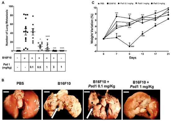 Mice were injected via the lateral tail vein with 100 µL of PBS only (137 mM NaCl, 2.7 mM KCl, 10 mM Na2HPO4, 2 mM KH2PO4, pH 7.4) (n = 17) or 100 µL of B16F10 cells (2.5 × 105 cells/animal suspended in DMEM) (n = 15). Other groups of animals were intravenously co-injected with a freshly prepared, in order to avoid B16F10 cells death, mix of B16F10 cells plus 0.1 mg/kg (n = 8), 0.5 mg/kg (n = 8), 1 mg/kg (n = 17), or 3 mg/kg Psd1 (n = 7).
