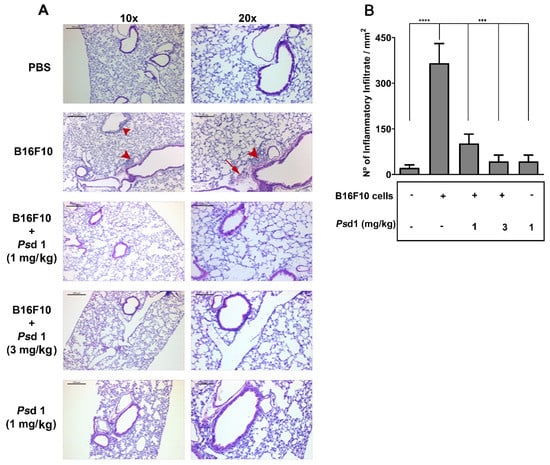 Psd1 inhibited the appearance of inflammatory cells in lung tissues. Two animals from each group of the in vivo experiment were anaesthetized and submitted to transcardial perfusion for further histological procedures. The lungs were removed and prepared for hematoxylin and eosin (HE) staining as described in the Materials and Methods. (A) Representative images from the lungs of one animal from each experimental group. Animals injected with just B16F10 cells showed the presence of infiltrating cells around blood vessels (red head arrows) and fibrotic lesions (red arrow) compared to animals from the other groups. The left and right panels indicate 10× and 20× magnifications, and the bars represent 200 and 100 µM, respectively. (B) Quantification of inflammatory infiltration (± SEM) was obtained in six fields, corresponding to 90% of the tissue. A significant reduction in inflammatory cells was observed in animals treated with Psd1. **** p < 0.0001 for B16F10 vs. PBS or *** p < 0.001 forB16F10 vs. Psd1 1 mg/kg or B16F10 vs. Psd1 3 mg/kg or Psd1 1 mg/kg alone. Values represent the mean ± SD of two independent experiments analyzed by one-way ANOVA and Bonferroni’s multiple comparison test.