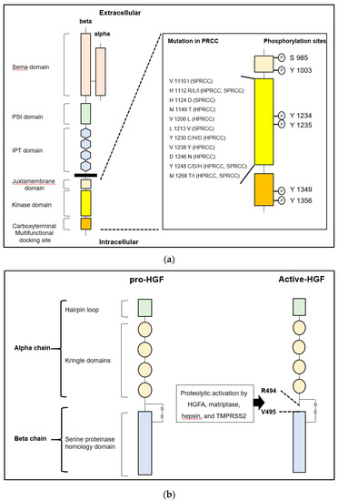 (a) Left: The structure of human MET is shown. MET consists of extracellular alpha and single-pass transmembrane beta chain, which are disulfide-linked heterodimer. The beta chain is composed of six major domains including Sema (semaphorin), PSI (plexin, semaphorin, integrin), IPT (immunoglobulin-like regions in plexins and transcription factors), juxtamembrane, tyrosine kinase domain, and multifunctional docking site. Right: Sites of point mutation in hereditary and sporadic papillary renal cell carcinoma (HPRCC and SPRCC) and conventional phosphorylation sites in intracellular domains are shown. (b) Left: The structure of human pro-hepatocyte growth factor (HGF) is shown. HGF consists of four Kringle domains and a serine proteinase homology domain. Right: The active form of HGF is shown. HGFA, hepsin, matriptase, and TMPRSS2 proteolytically cleave between Arg 494 and Val 495 to convert to a two-chain heterodimeric active form. One-letter abbreviation of amino acids is used.